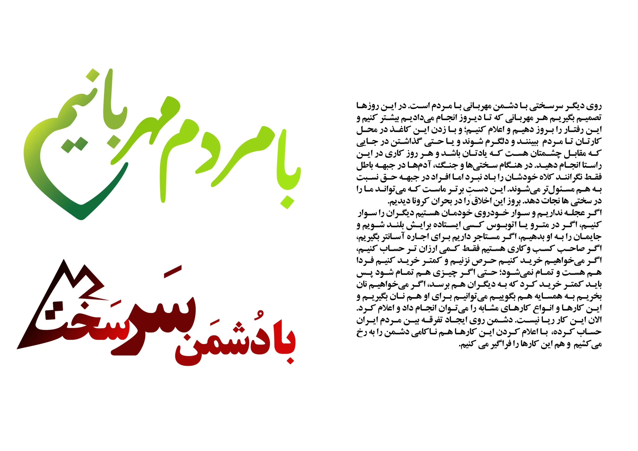 روی دیگر سرسختی با دشمن مهربانی با مردم است. در این روزها تصمیم بگیریم هر مهربانی که تا دیروز انجام میدادیم بیشتر کنیم و این رفتار را بروز دهیم و اعلام کنیم؛ و با زدن این کاغذ در محل کارتان تا مردم ببینند و دلگرم شوند و یا حتی گذاشتن در جایی که مقابل چشمتان هست که یادتان باشد و هر روز کاری در این راستا انجام دهید. در هنگام سختیها و جنگ، آدمها در جبهه باطل فقط نگرانند کلاه خودشان را باد نبرد اما افراد در جبهه حق نسبت به هم مسئولتر میشوند. این دستِ برتر ماست که میتواند ما را در سختی ها نجات دهد. بروز این اخلاق را در بحران کرونا دیدیم.